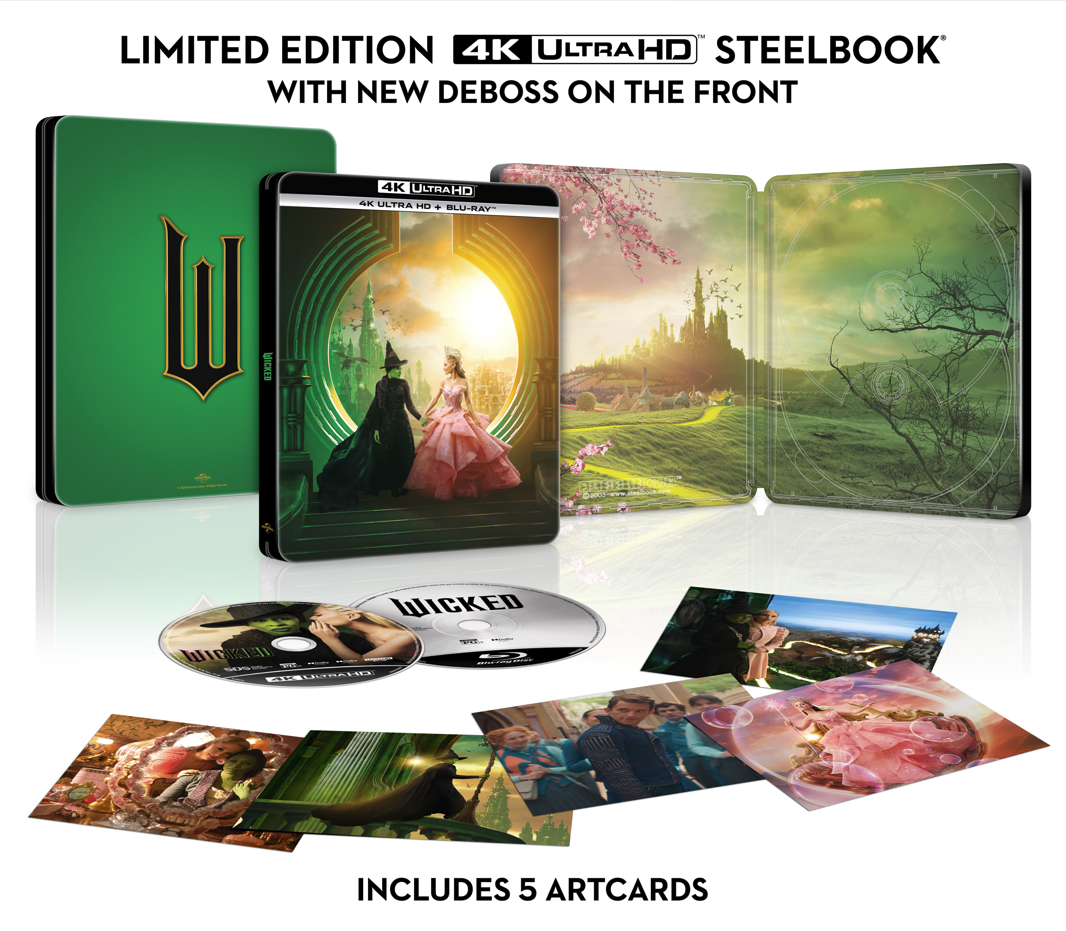 Wicked 4k Ultra HD Steelbook returns better than ever and just in time for the second part – Wicked for Good! This steelbook reprint features an improved deboss effect on the front and comes with five collectable artcards. This deboss reprint with artcards version is exclusive to the UK and limited to 3000 units.