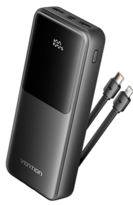 Vention 20000mAh Power Bank (Micro-USB + USB-C + USB-A + USB-A) with Built-in USB-C and Lightning Cables 22.5W Black LED Display Type [Accessories]