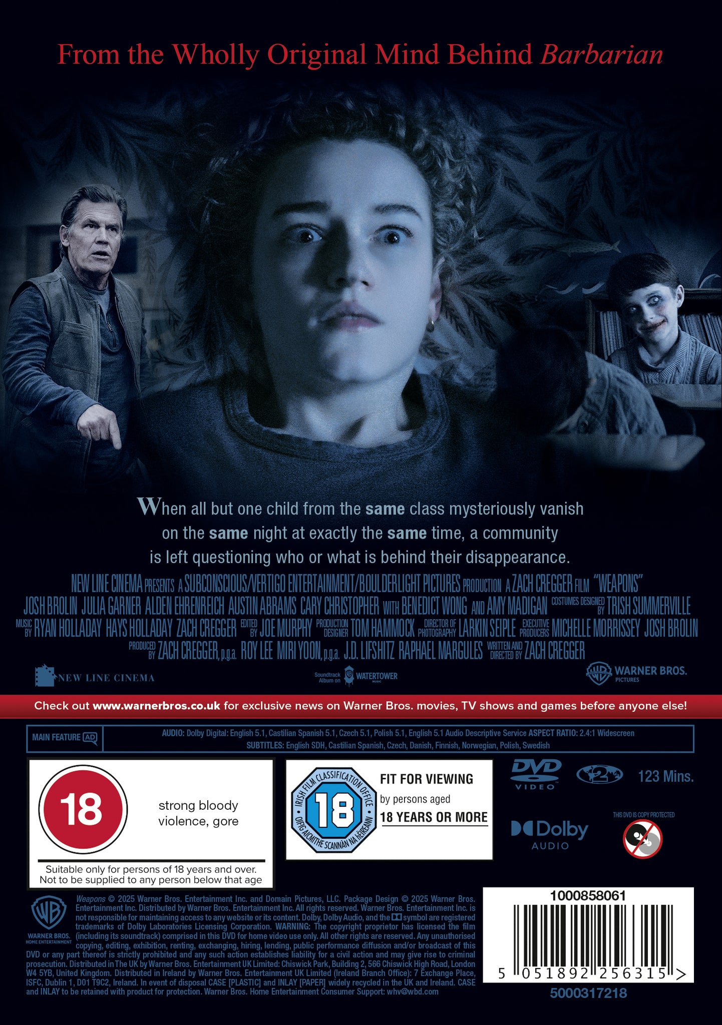 From New Line Cinema and Zach Cregger, the wholly original mind behind Barbarian, comes a new horror/thriller: Weapons. When all but one child from the same class mysteriously vanish on the same night at exactly the same time, a community is left questioning who or what is behind their disappearance