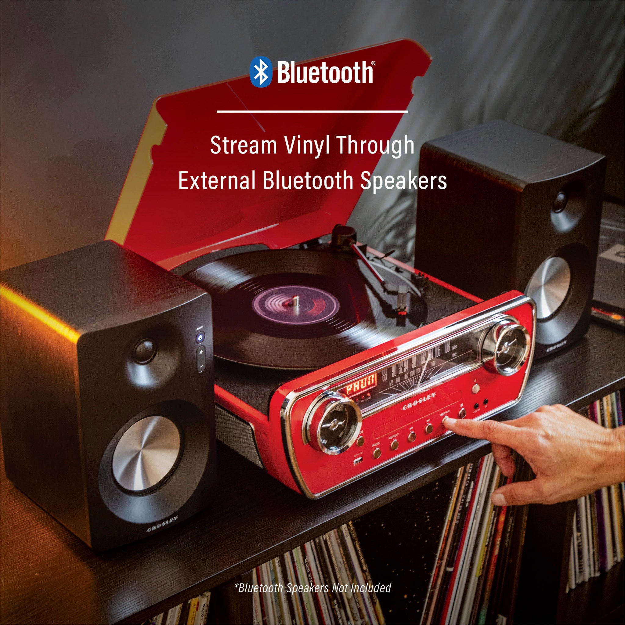 The Powel 7-in-1 Record Player merges retro design with modern sound. Designed like the dashboard of a vintage car, it’s a throwback to Crosley’s roots — named after our founder who brought the world the car radio. This entertainment centre comes loaded with a 3-speed turntable, AM/FM radio, CD player, and Bluetooth in/out capability. Whether you’re spinning vinyl or streaming, it’s about bringing music to everyone, just like Crosley has for over a century.