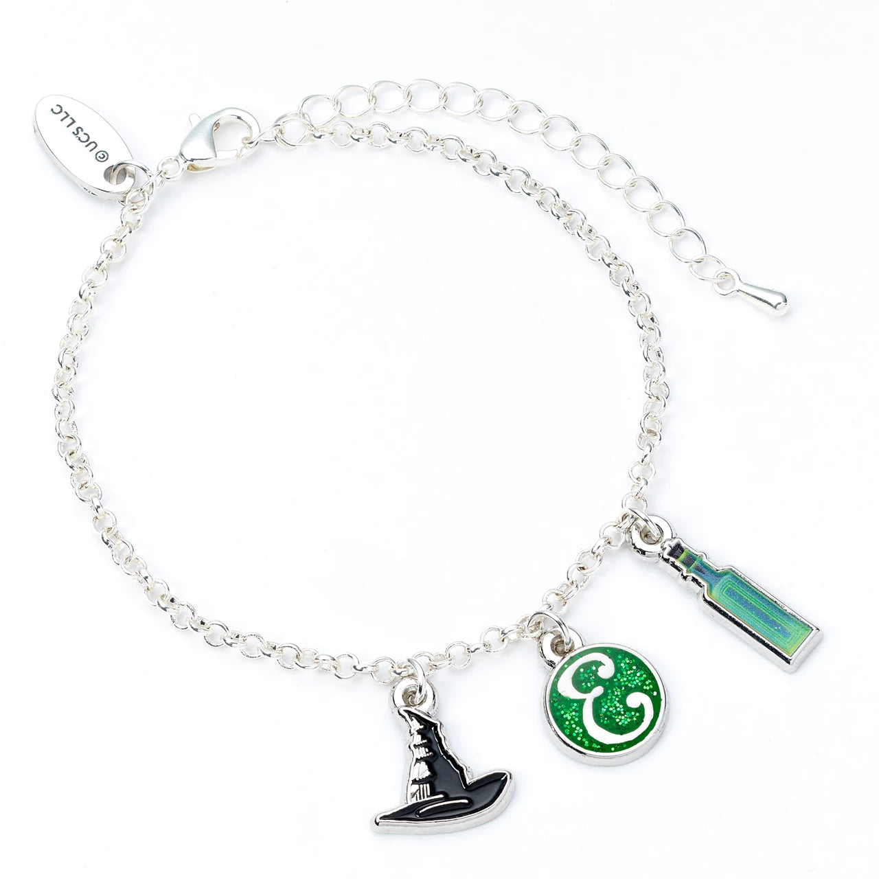 Celebrate your love for Elphaba with this playful charm bracelet featuring icons inspired by the Wicked for Good movie. It includes a hat, an E emblem, and a potion bottle-perfect for showing your Elphaba spirit. The adjustable chain fits wrists from 15cm to 16.5cm, making it a charming accessory for fans aged 14 and up. Officially licensed and ready to enchant!