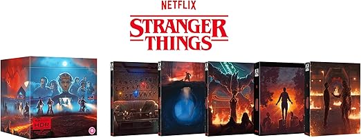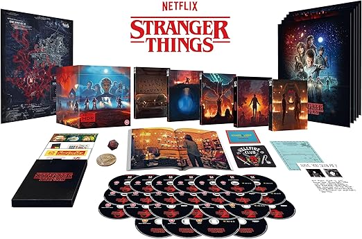 Netflix and Arrow Video are proud to present all five seasons of STRANGER THINGS for the first time on home video. This definitive, dimension-splitting Deluxe collection features brand new artwork, more than five hours of bonus features, a 148-page artbook plus memorabilia from across the STRANGER THINGS universe.