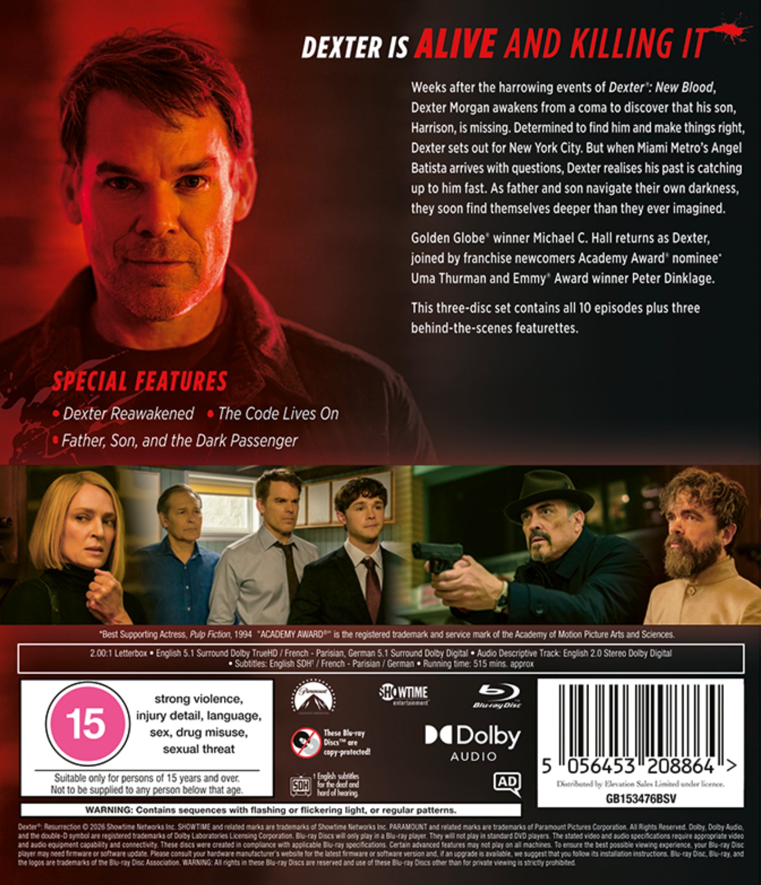Weeks after the harrowing events of Dexter®: New Blood, Dexter Morgan awakens from a coma to discover that his son, Harrison, is missing. Determined to find him and make things right, Dexter sets out for New York City. But when Miami Metro’s Angel Batista arrives with questions, Dexter realises his past is catching up to him fast. As father and son navigate their own darkness, they soon find themselves deeper than they ever imagined. Golden Globe® winner Michael C. Hall returns as Dexter, joined by franchise newcomers Academy Award® nominee* Uma Thurman and Emmy® Award winner Peter Dinklage. This three-disc set contains all 10 episodes plus three behind-the-scenes featurettes.