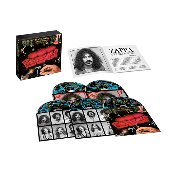 Frank Zappa's epic 1975 release 'One Size Fits All' celebrates its 50th Anniversary with a jam-packed multi-disc box set with 75% unreleased material. Official Zappa release #131 contains four CDs that feature the 2012 main album remaster by legend Bob Ludwig along with a disc and a half of studio outtakes, work mixes and relevant Vault nuggets. A complete live show from Rotterdam, Netherlands '74 is also included with bonus live tracks from the same legendary European tour. The live line-up consisted of the classic 6-piece band featuring George Duke and Ruth Underwood. Ruth also contributed new liner notes for the package along with historical essays by David Fricke and 'Vaultmeister' Joe Travers. The 50th anniversary booklet also contains newly revealed photos by Sam Emerson accompanying the bespoke liner notes. The Blu-Ray disc features brand new Dolby Atmos and 5.1 mixes directly from the 24-track album master tapes, Hi-Res versions of the main album, and two bonus vault surround tracks featuring vintage mixes by Zappa himself. Also included are two bonus videos, taken from the classic KCET-TV shoot, re-edited for the first time since FZ had his hands on the footage back in 1974. Tenth studio album 'One Size Fits All' by Frank Zappa and the Mothers of Invention, released in June 1975. This is the last studio album by the band and features one of Zappa's most complex tracks, 'Inca Roads'. One of Zappa's heroes, Johnny 'Guitar' Watson, guests on two tracks: 'San Ber'dino' and 'Andy'.