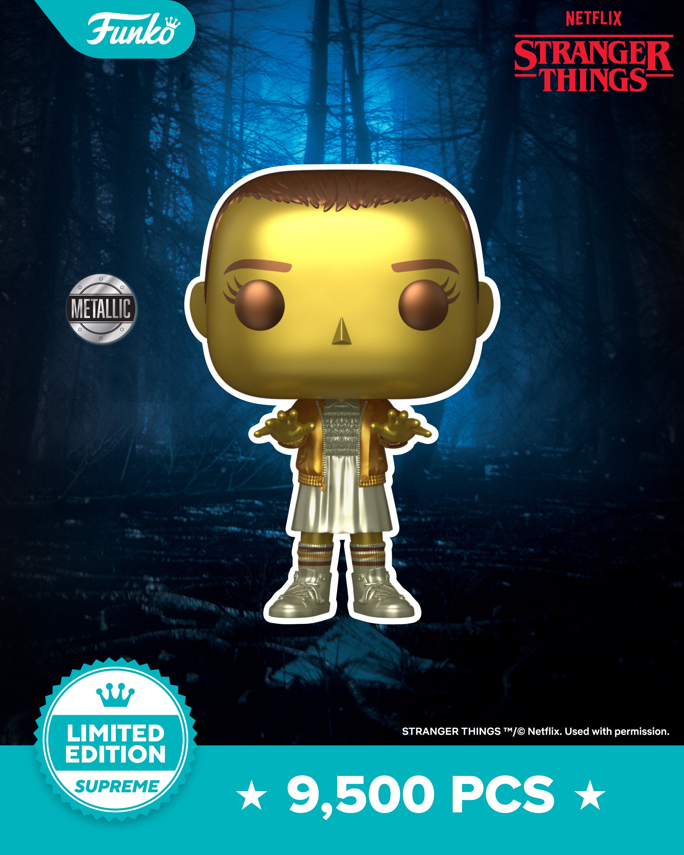 Dark forces are lurking beneath Hawkins, Indiana. Witness the dangerous and supernatural secrets of the Upside Down with this exclusive POP! Eleven! Bring home the happenings, characters, and breakthrough moments of Stranger Things by making this metallic gold POP! Eleven the next addition to your POP! Television collection. Only 9,500 of this Limited Edition – SUPREME collectible were made! Vinyl figure is approximately 3.6 in (9.1 cm) tall.