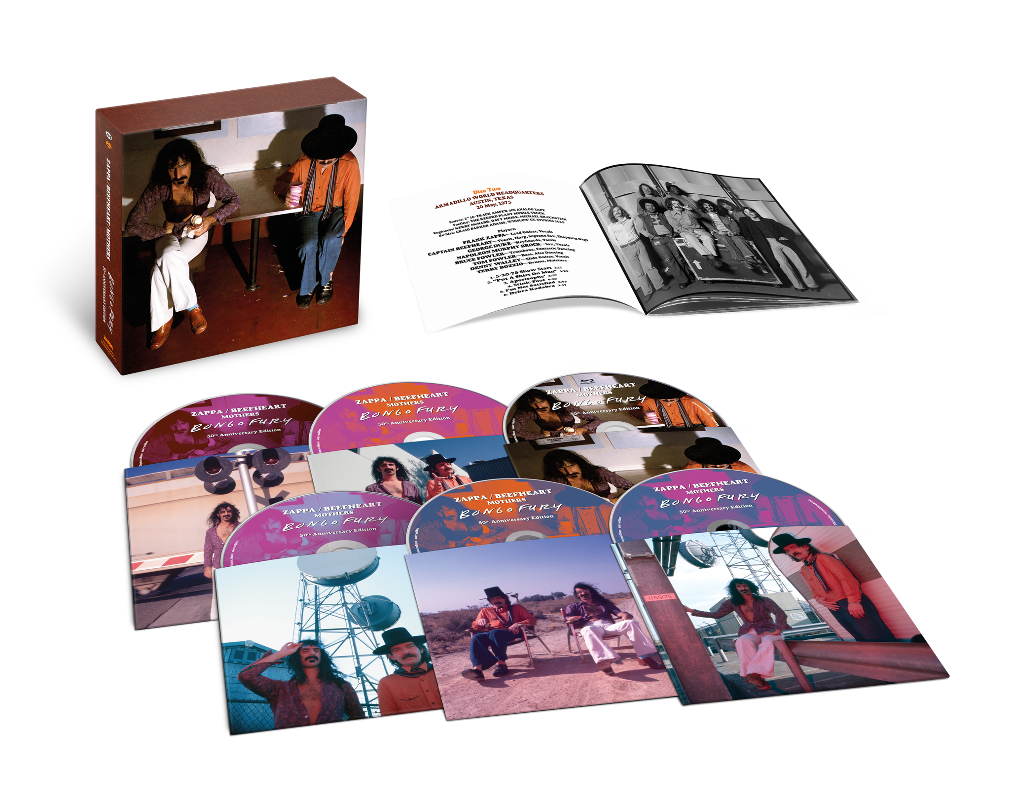 'BONGO FURY' turns 50!? The Zappa & Beefheart collab in May 1975 resulted in new songs, a tour, and album. 'Bongo Fury' is mostly live recordings from Austin, TX and the last to use the name 'Mothers' before it was retired in 1976. This box is 5 CDs of material including studio outtakes and two concerts. Also includes unseen photos and liner notes from guitarist, Denny Walley, plus Vaultmeister Joe Travers. Blu-Ray features new Dolby Atmos, 5.1 mixes, and high-res stereo audio with bonus surround experiences.