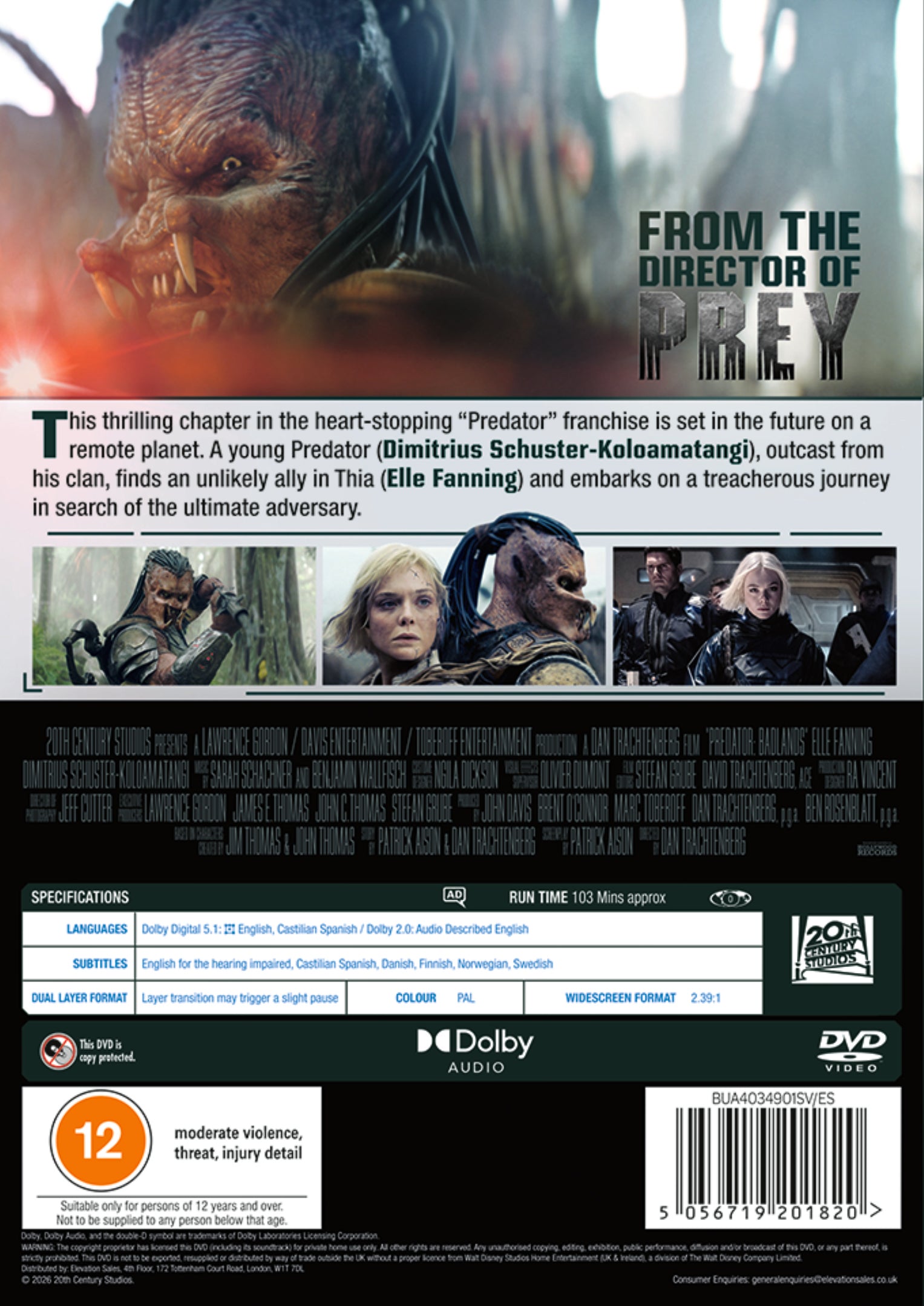 This thrilling chapter in the heart-stopping "Predator" franchise is set in the future on a remote planet. A young Predator (Dimitrius Schuster-Koloamatangi), outcast from his clan, finds and unlikely ally in Thia (Elle Fanning) and embarks on a treacherous journey in search of the ultimate adversary).
