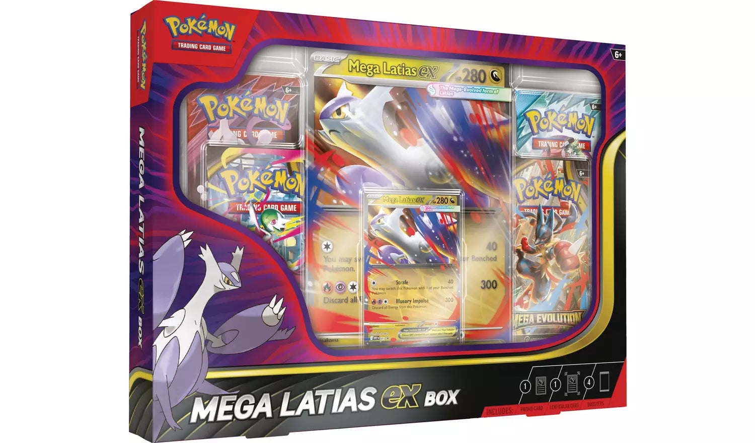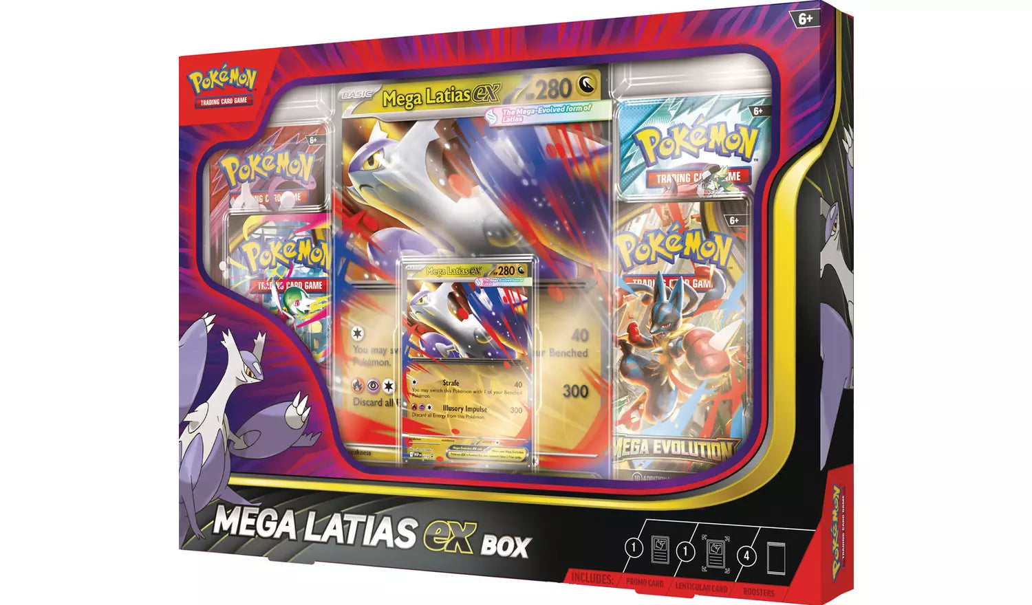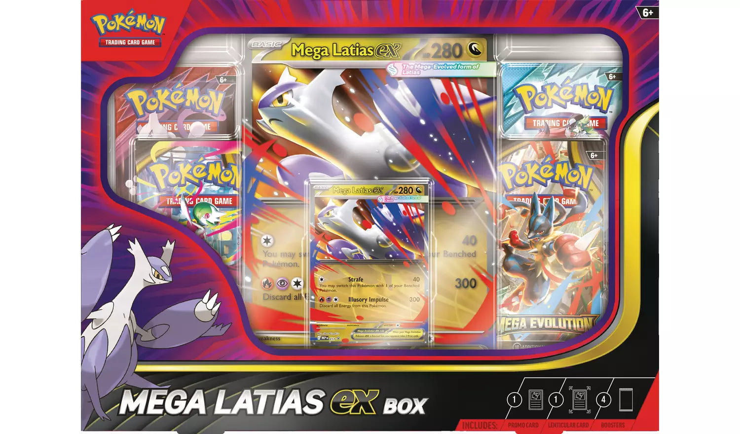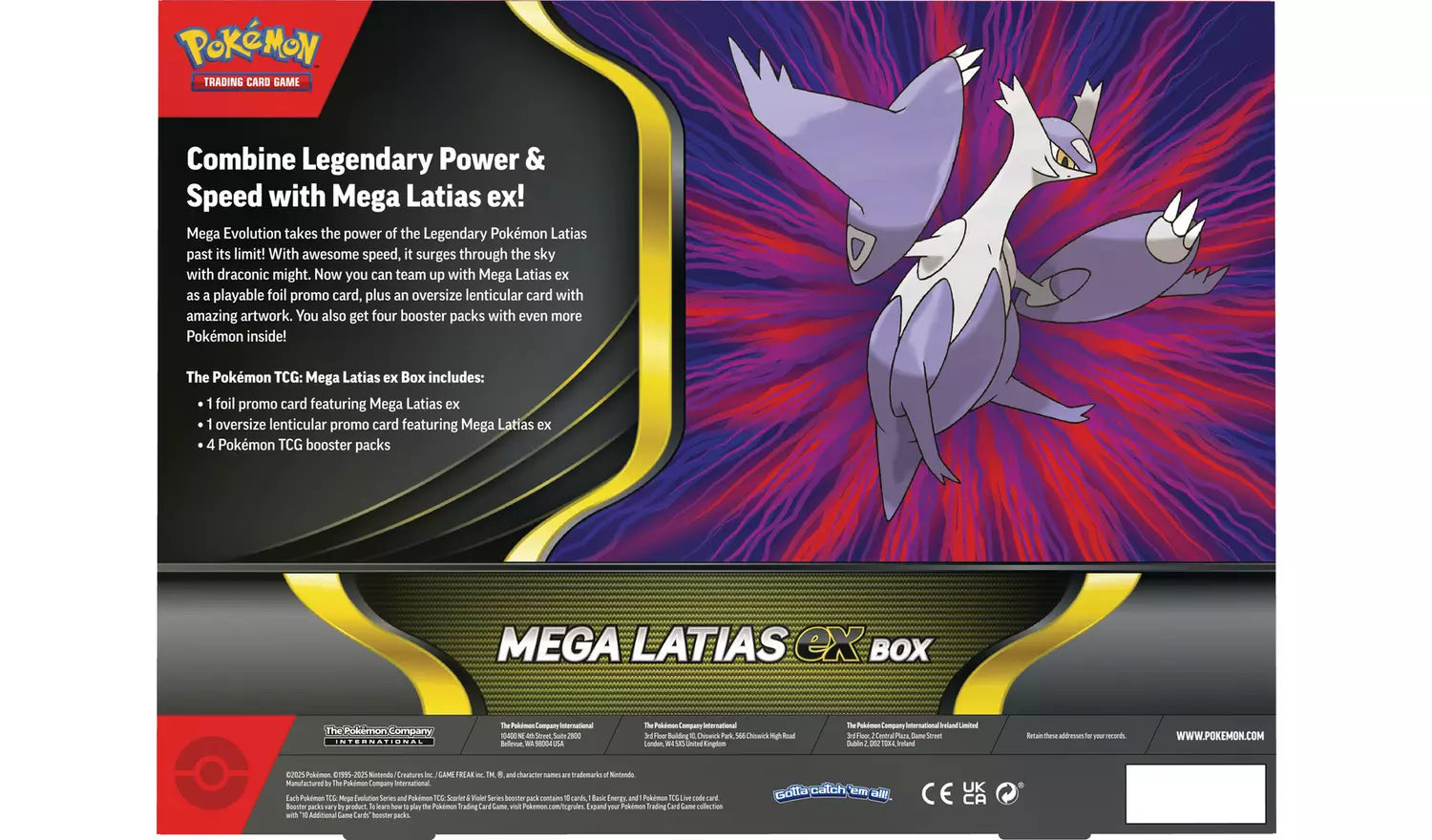 Combine Legendary Power & Speed with Mega Latias ex! Mega Evolution takes the power of the Legendary Pokemon Latias past its limit! With awesome speed, it surges through the sky with draconic might. Now you can team up with Mega Latias ex as a playable foil promo card, plus an oversize lenticular card with amazing artwork. You also get four booster packs with even more Pokemon inside!