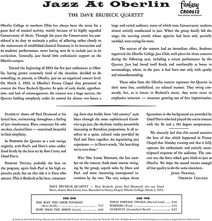 Recorded at Oberlin College, Ohio in 1953, the Dave Brubeck Quartet's 'Jazz at Oberlin' album is one of the earliest works in the cool jazz genre. As well as Dave Brubeck (piano) the album also features Paul Desmond (alto sax), Lloyd Davis (drums) and Ron Cotty (bass). This edition of the album is released as part of the Original Jazz Classics Series and is pressed on 180-gram vinyl at RTI with all-analogue mastering from the original tapes by Kevin Gray at Cohearent Audio. It is presented in a Tip-On Jacket. US Import.