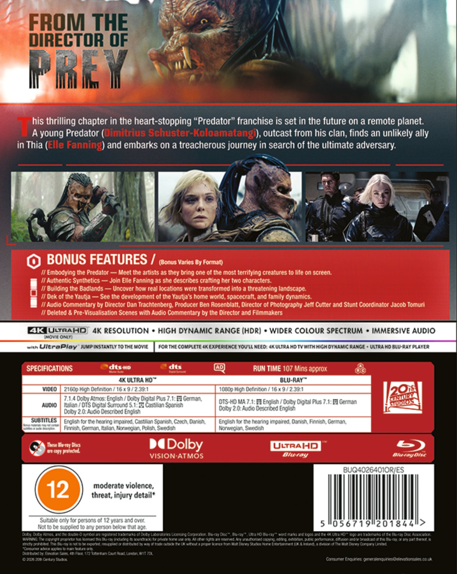 This thrilling chapter in the heart-stopping "Predator" franchise is set in the future on a remote planet. A young Predator (Dimitrius Schuster-Koloamatangi), outcast from his clan, finds and unlikely ally in Thia (Elle Fanning) and embarks on a treacherous journey in search of the ultimate adversary).